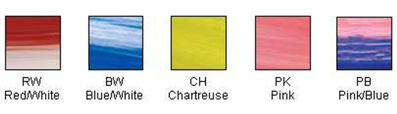 | Color | RW Red/White, BW Blue/White, CH Chartreuse, PK Pink, PB Pink/Blue |